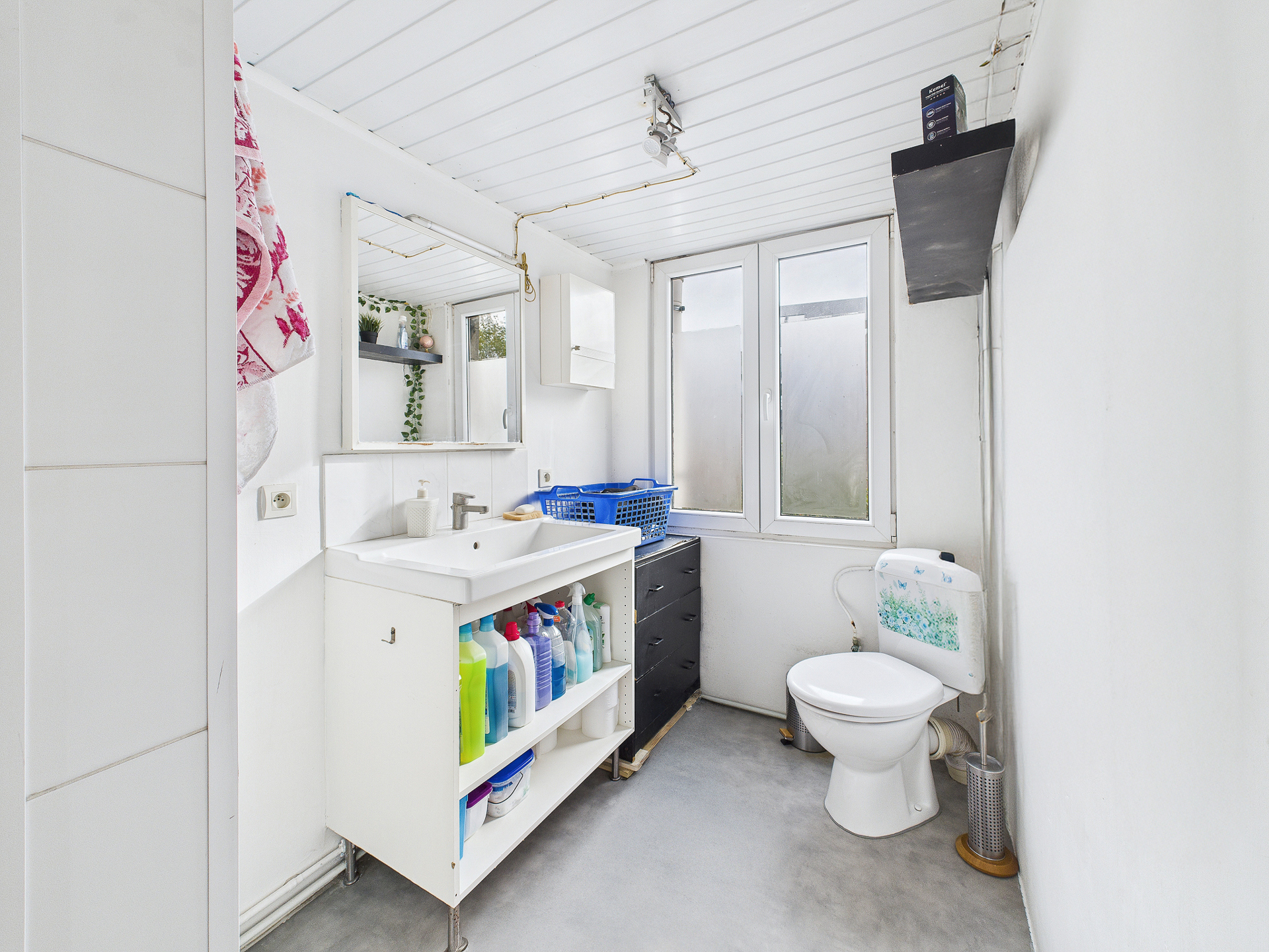 • Rez-de-chaussée (64 m²) : séjour, cuisine équipée (four, hotte, plaque vitrocéramique, évier inox), salle d’eau (lavabo, WC, douche, chauffe-eau électrique « Van Marcke »), une chambre et un bureau + terrasse et jardin, une cave. Loyer : 630,00 euros/mois. PEB: E.