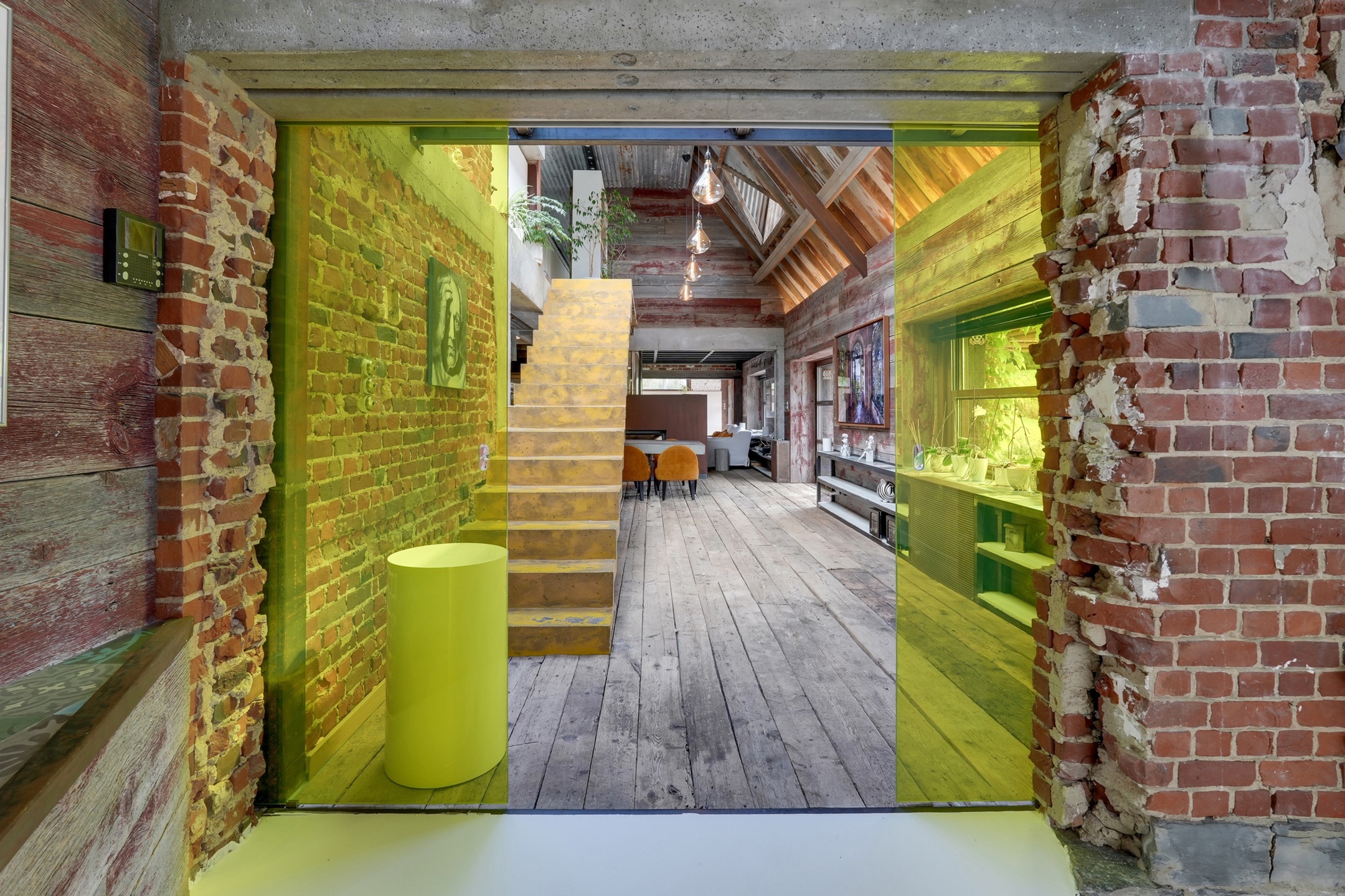 En poussant la porte coulissante, on découvre une vaste pièce de vie baignée de lumière, dans laquelle se distingue un escalier en béton brut menant à l’étage.