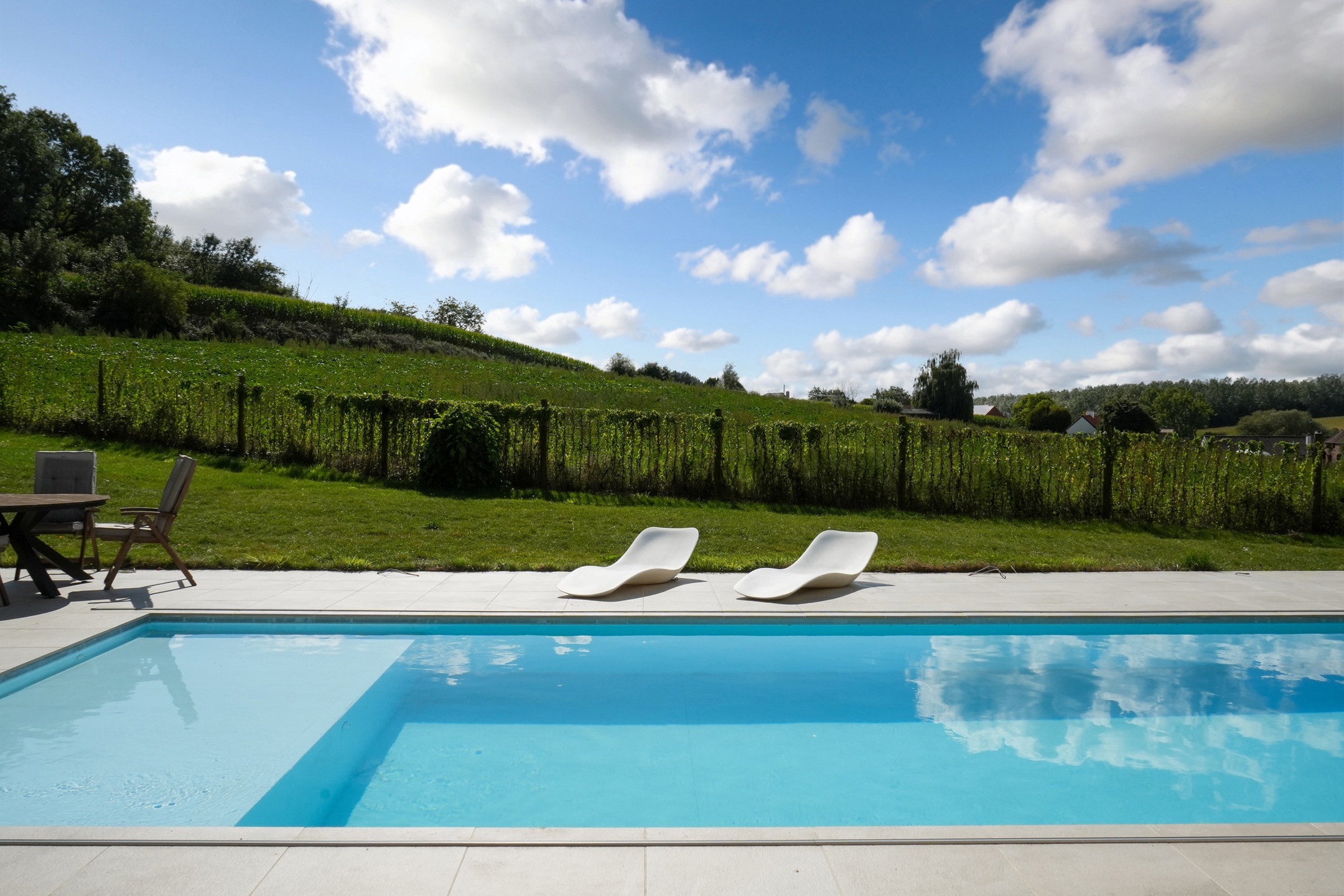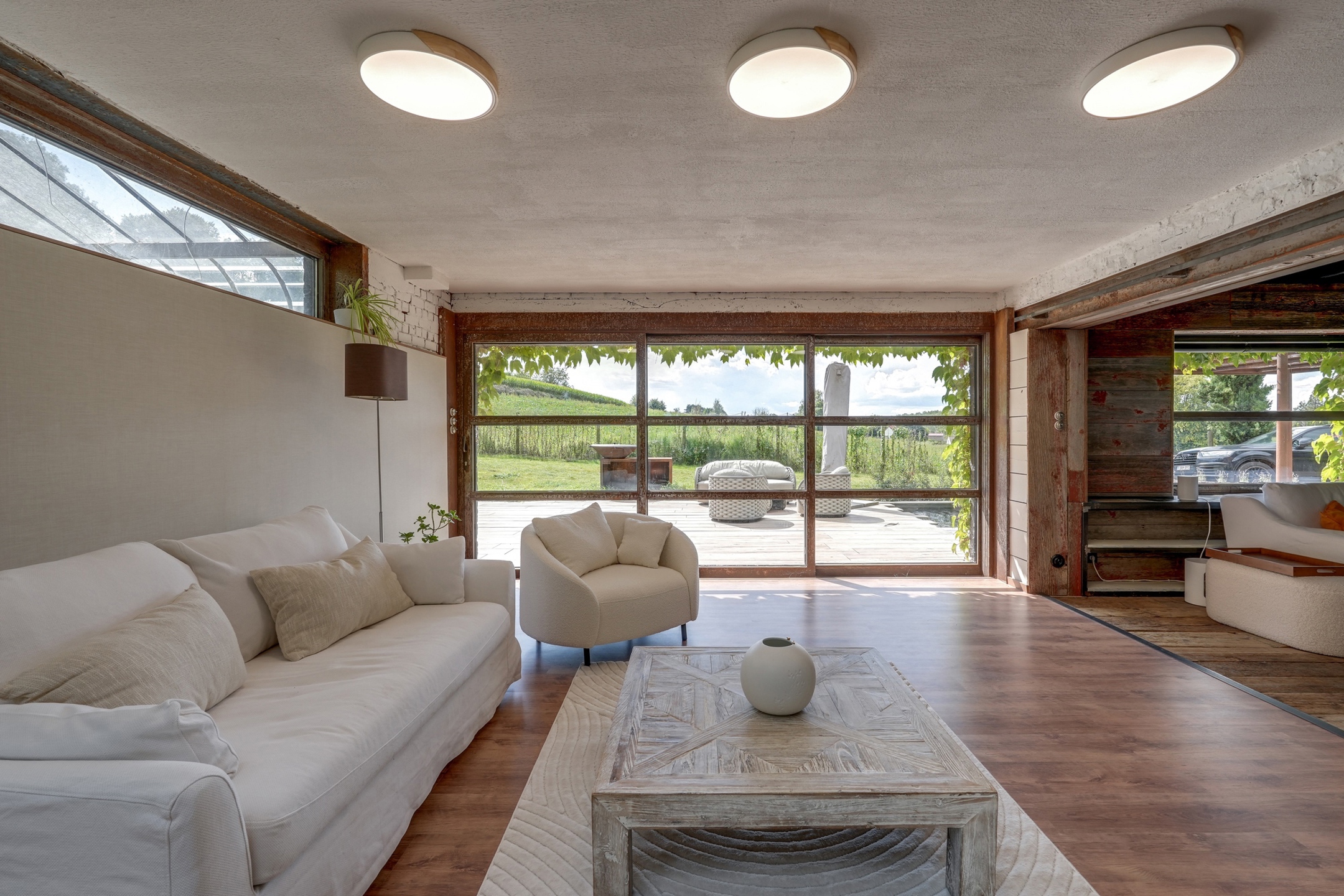 Dans le prolongement du salon, un second espace salon s’ouvre largement sur l’extérieur, offrant une vue imprenable sur la piscine.