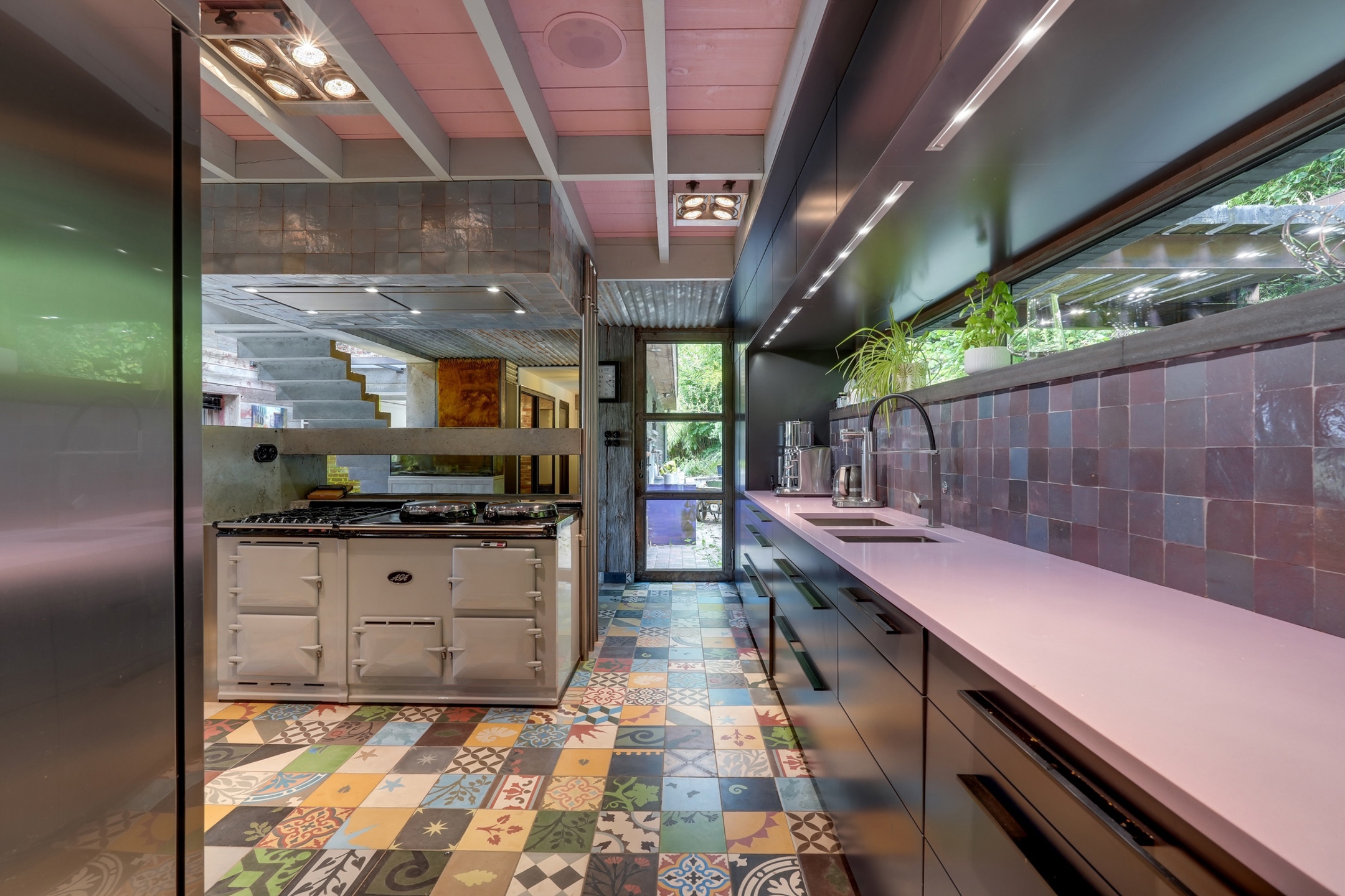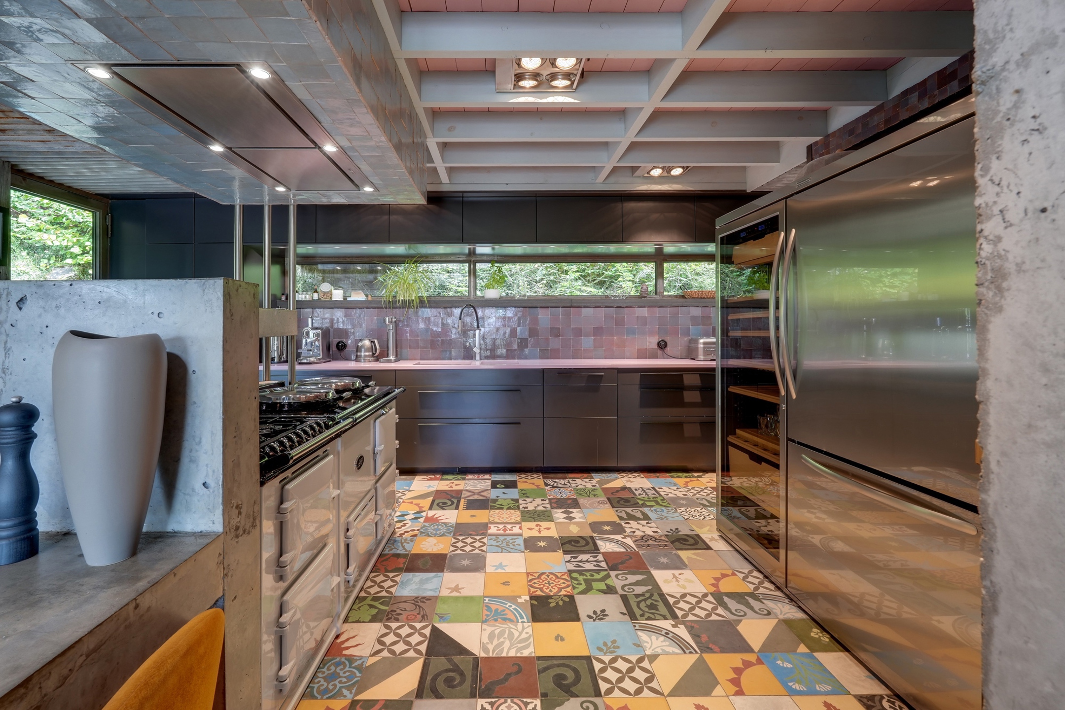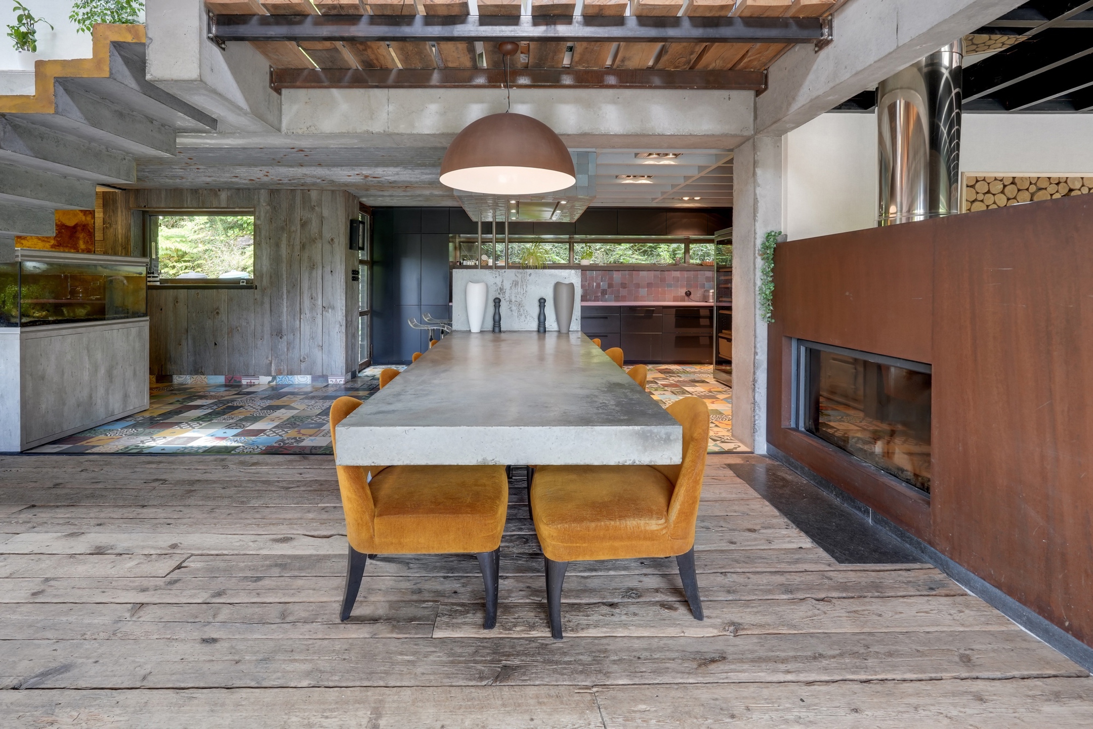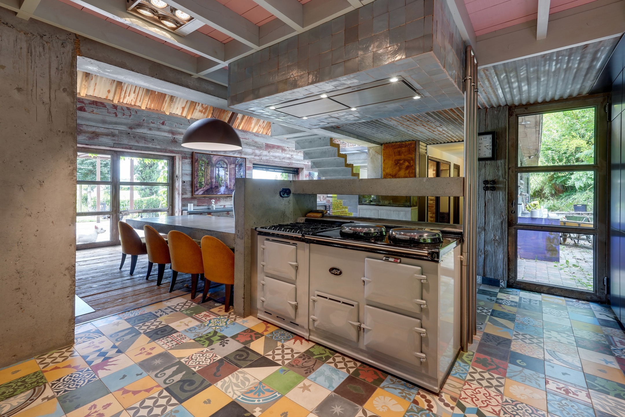 La cuisine ouverte s’intègre facilement au style de la maison avec sa grande table en béton et sa cuisinière AGA, alors qu`entre le salon et la cuisine se trouve un poêle à bois qui séparée les deux pièces.
