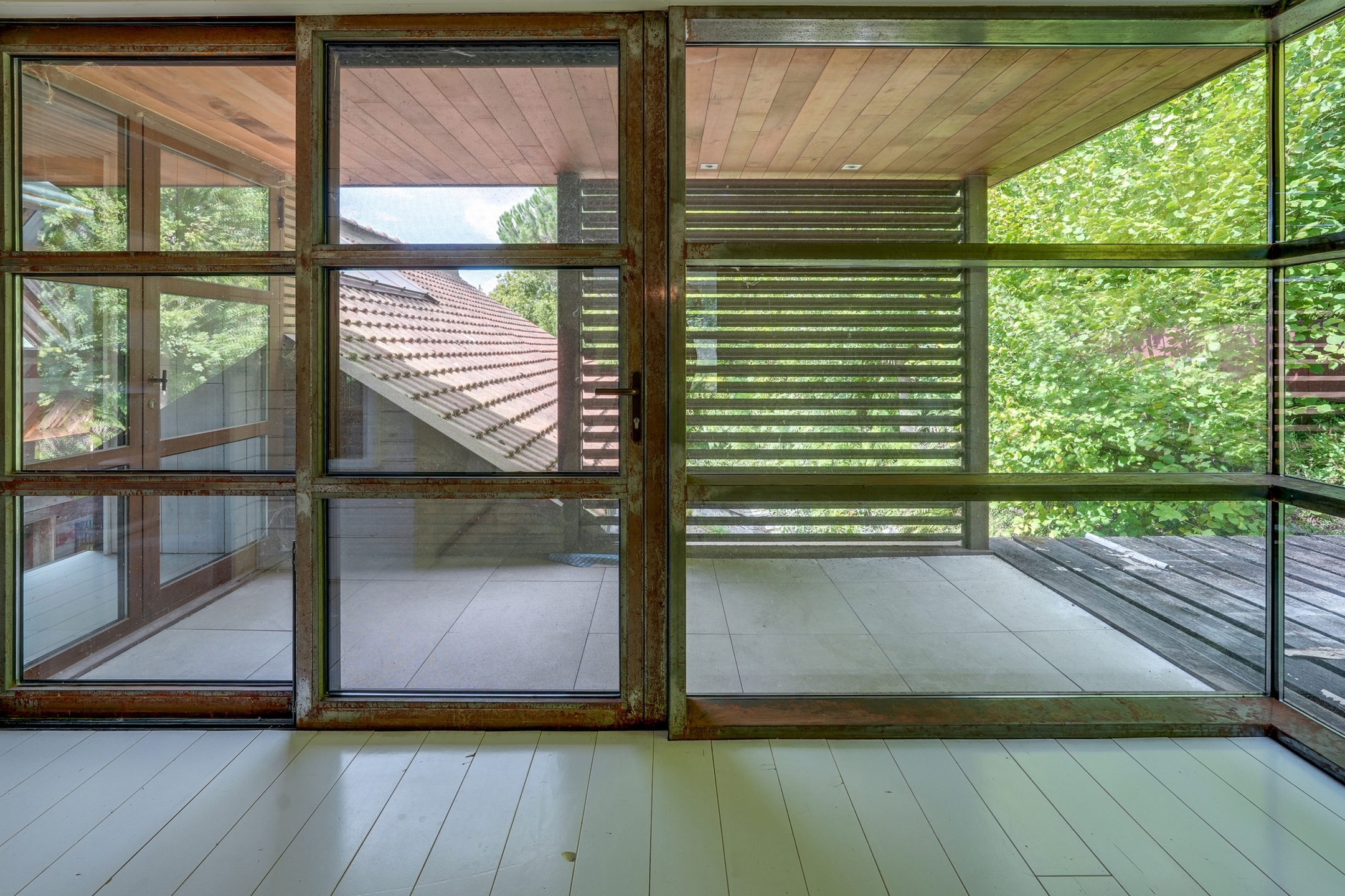 À l’étage, on arrive sur une mezzanine lumineuse avec une grande ouverture donnant un accès direct vers l’extérieur.