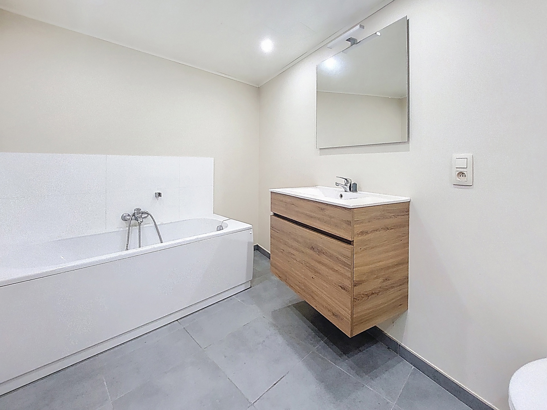 Salle de bains avec baignoire, meuble lavabo et WC,