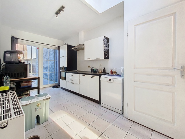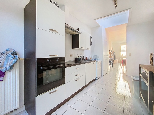 Cuisine équipée avec évier, four, taque induction, hotte, frigo, lave-vaisselle et rangements,