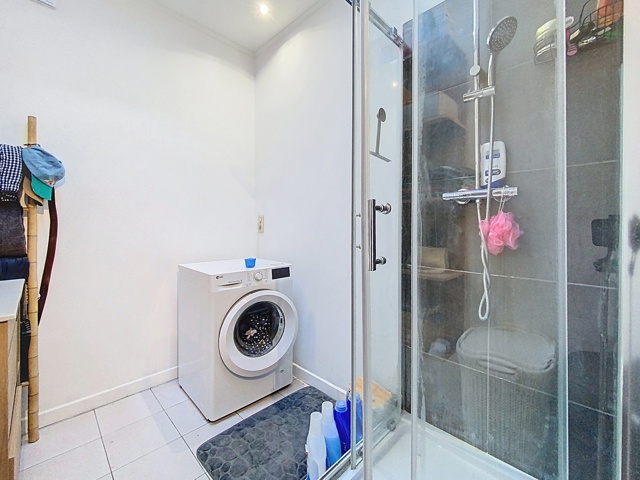 Salle de bain avec douche, meuble lavabo et emplacement machine à laver,
