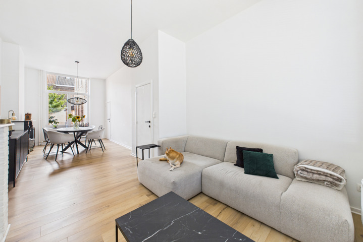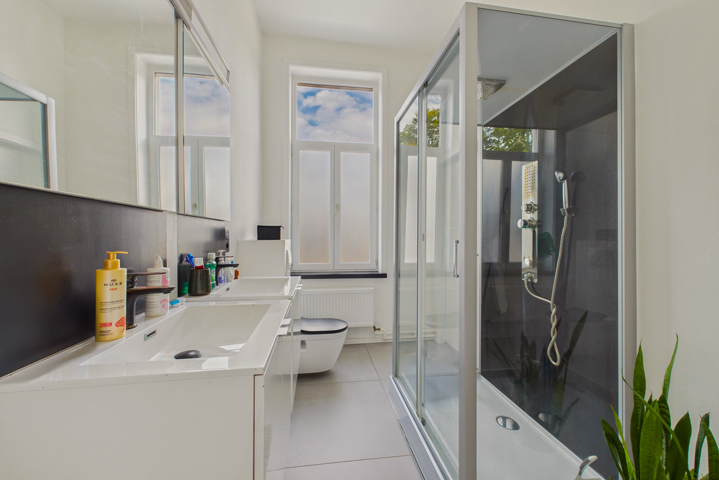 Rez-de-chaussée : Hall d’entrée accueillant avec escalier ouvert. Le lumineux séjour dégage une atmosphère conviviale grâce à la grande fenêtre en façade. À la suite, la cuisine équipée comprend taque de cuisson, hotte, réfrigérateur, congélateur, four et nombreux rangements. Depuis la cuisine, on accède à une vaste buanderie, également accessible directement de l’extérieur. La maison bénéficie en outre d’un agréable jardin de ville avec terrasse neuve, idéal pour profiter du calme.