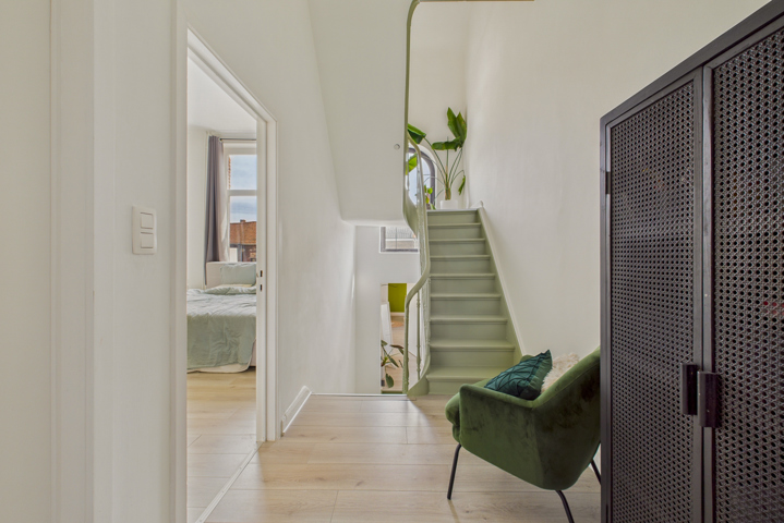 1er étage : Hall de nuit avec escalier ouvert et une spacieuse chambre lumineuse.