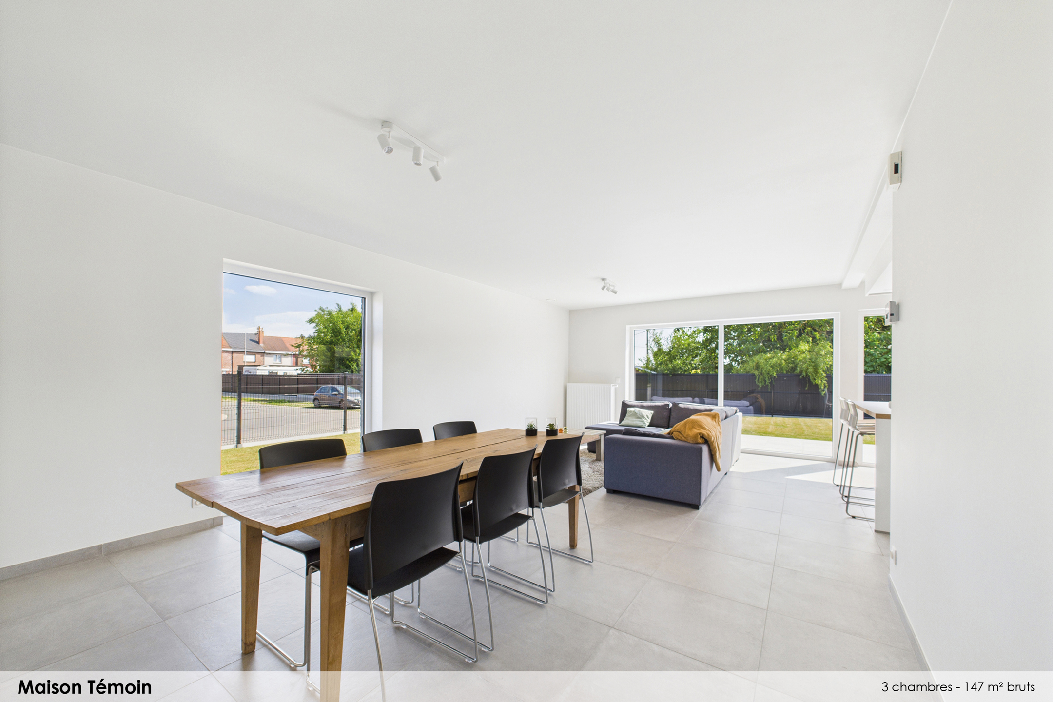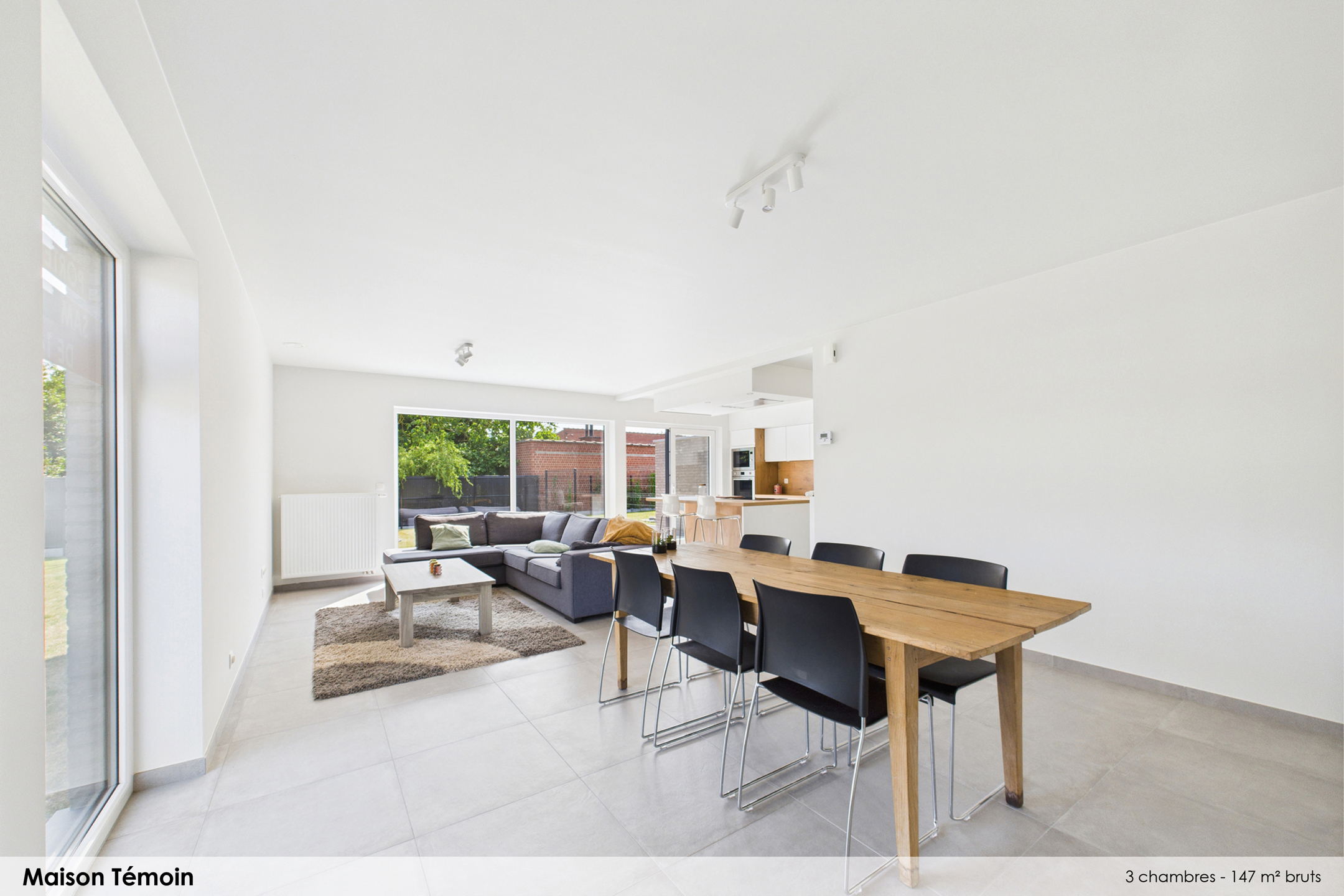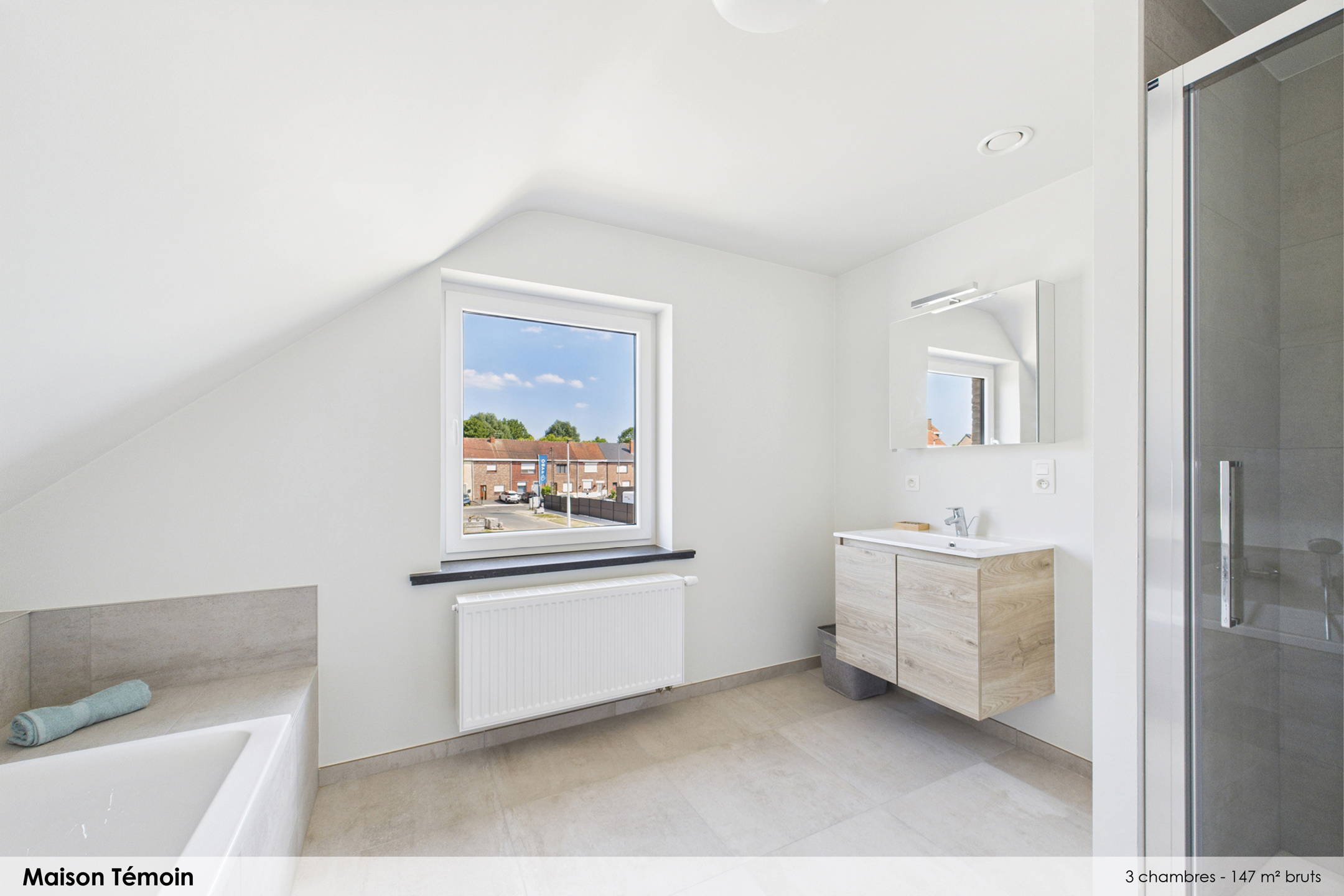 Maison 3 chambres avec jardin, garage et parking à Herseaux Prestations- Agencement - Rez-de-chaussée : hall d`entrée, WC séparé avec lave-mains, séjour avec cuisine ouverte VERVENNE- Agencement - Etage : 3 chambres dont une avec dressing et salle de bains avec douche, baignoire, meuble vasque et WC- Espaces extérieurs : terrasse carrelée et jardin clôturé non engazonné- Confort et [..]