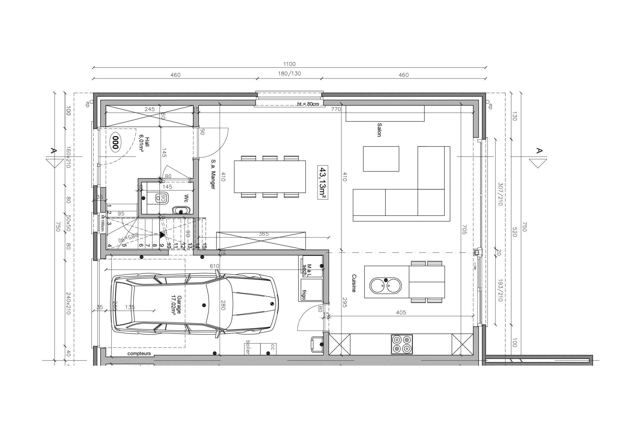 - Revêtements de sol : carrelage dans la pièce de vie et la salle de bain, parquet dans les chambres, carrelage anti-graisse dans le garage