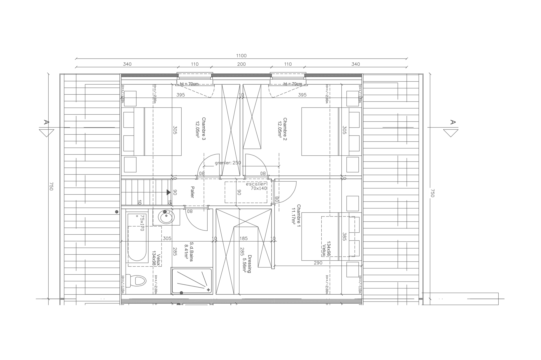 - Agencement - Etage : 3 chambres dont une avec dressing et salle de bains avec douche, baignoire, meuble vasque et WC