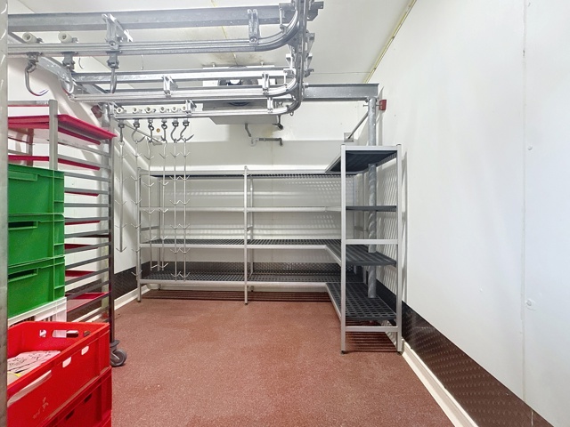 Grande chambre froide et atelier avec rails pour déplacer la viande,