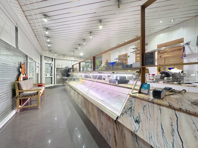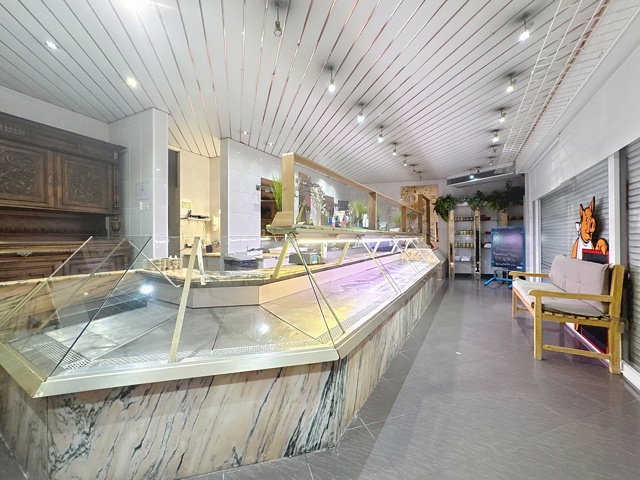Espace de vente avec un grand présentoi en marbre réfrigéré et frigo de présentation,