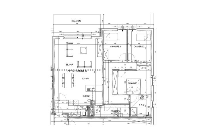 - Agencement : hall d`entrée desservant un WC séparé avec lave-mains, 3 chambres et une salle de bain avec douche, meuble vasque, colonne de rangement et miroir avec éclairage, séjour avec cuisine équipée ouverte, buanderie