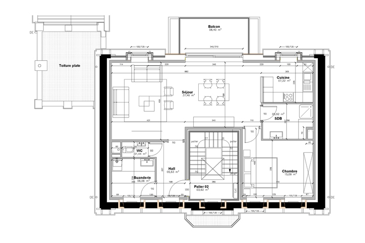 Les surfaces indiquées ne sont pas des surfaces habitables mais des surfaces brutes, selon le code de mesurage appliqué en Belgique