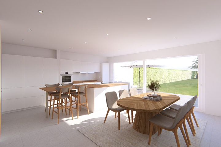 : châssis PVC double-vitrage, porte de garage motorisée, escalier en hêtre