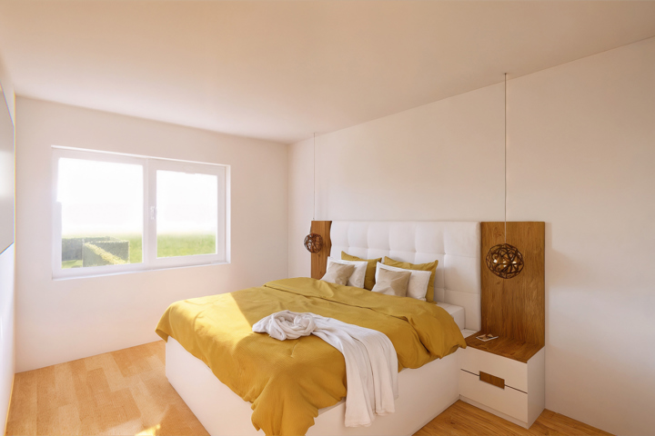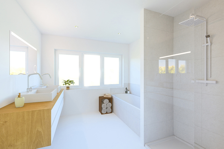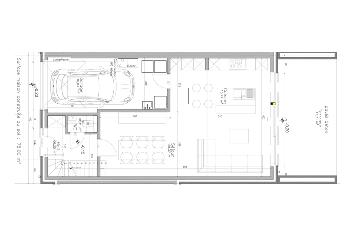 - Revêtements de sol : carrelage dans la pièce de vie et dans la salle de bain, parquet dans les chambres, carrelage anti-graisse pour le garage