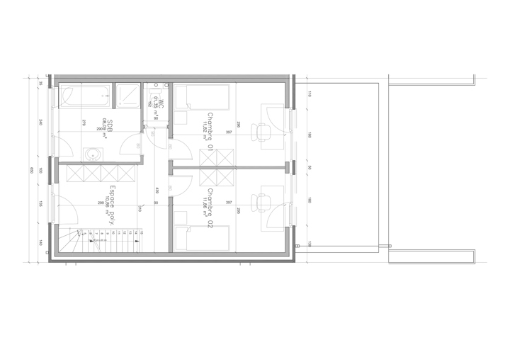 - Agencement - Etage : 2 chambres, espace polyvalent, salle de bains avec douche, baignoire, meuble vasque, WC séparé sur le palier