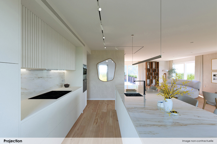 - Agencement : Hall, séjour avec cuisine ouverte, buanderie, WC séparé avec lave-mains, 2 chambres, salle de douche avec meuble vasque et douche 120 x 90 cm, ascenseur