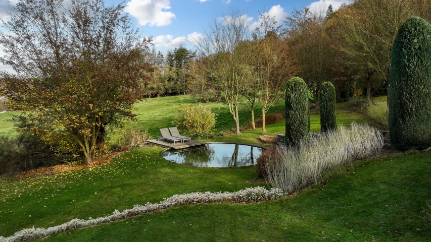 Implantée sur un terrain de 35 ares magnifiquement paysager, elle déploie un cadre de vie unique où la sérénité règne : piscine naturelle, étang à koï, allées de promenade et plusieurs terrasses, dont une couverte, permettant de profiter, au fil des heures et des saisons, de différents points de vue sur la nature.