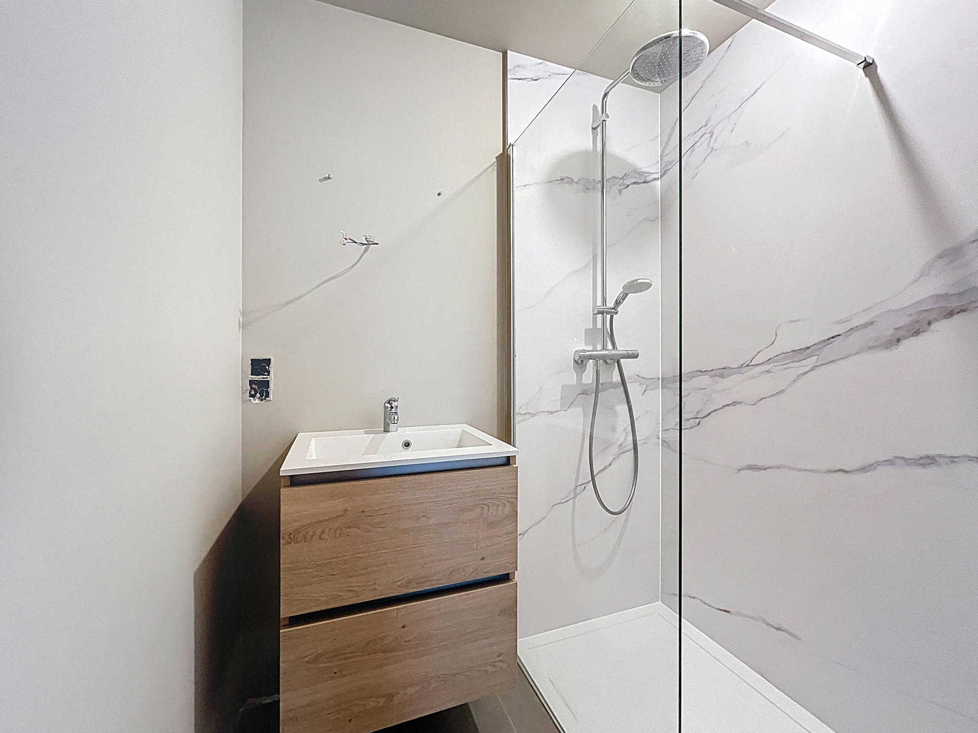 La salle de bain est équipée d’une douche et d’un lavabo.