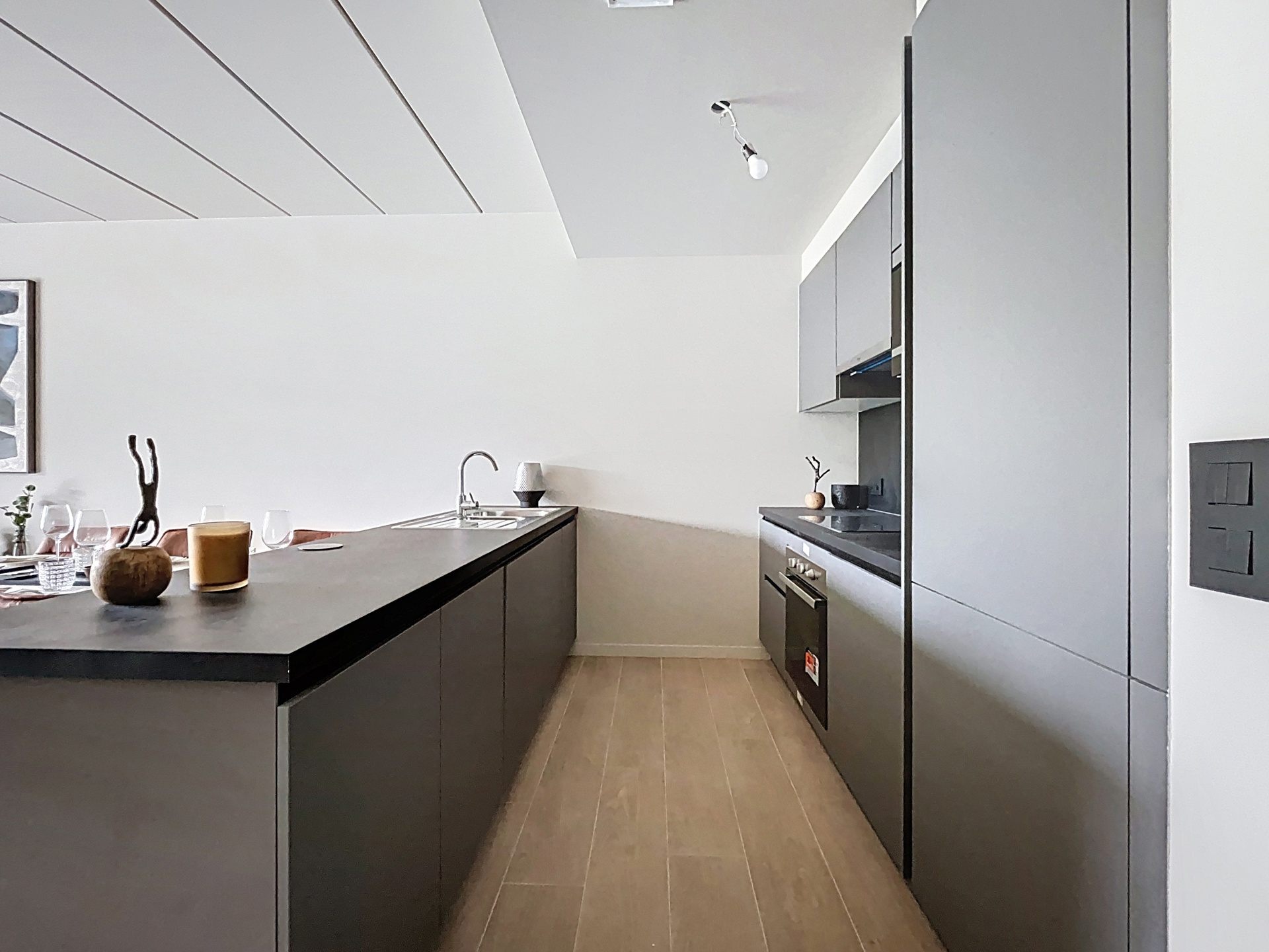 Un espace de vie convivial avec une cuisine entièrement équipée (four, taques, hotte, micro-ondes, évier, lave-vaisselle, frigo et congélateur). accèdant sur une tarrasse en roof top.